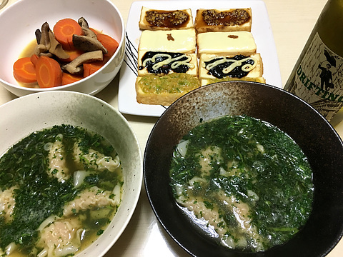 厚揚げの変わり田楽、他 本日のメニューは、上段左からにんじんとしいたけのバターコンソメ煮、厚揚げの変わり田楽、下段がモロヘイヤのワンタンスープ、です。 厚揚げの変わり田楽は、スライスした厚揚げの上にチーズやタレなどを乗せて、トースターで軽くあぶったものです。