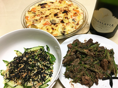 本日のメニューは、上段がにんじんとブルーチーズラビオリのグラタン、下段左からきゅうりのゴマだれふりかけ和え、鶏レバーとセロリの焼き鳥のたれ炒め、です。