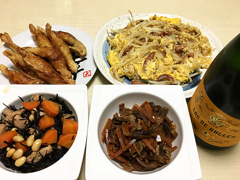 本日のメニューは、上段左から鶏皮餃子(既製品を揚げたもの)、もやしの玉子炒め、下段左から大豆とひじきのコンソメ煮、切り干し大根の煮物、です。