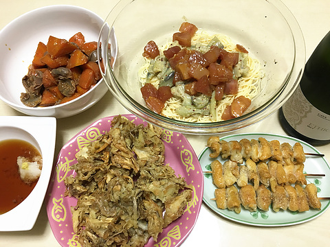 マグロの漬けと蒸しナスの冷製パスタ、他 本日のメニューは、上段左から砂肝とにんじんの味噌煮、マグロの漬けと蒸しナスの冷製パスタ、下段左からマイタケの天ぷら&天つゆ付き、鶏皮の焼き鳥(塩)、です。 例のごとく、焼き鳥はちまちまとひとつずつ鶏皮を手で串に刺していってます。