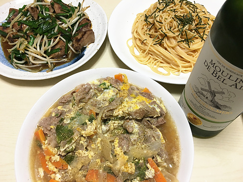 本日のメニューは、上段左からレバニラ炒め、たらこスパゲティ、下段が牛肉とにんじんの卵とじ、です。