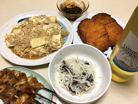 本日のメニューは、上段左から豆腐とえのきのにんにくダレ炒め、味噌カツ(既製品を揚げたもの)、下段左から焼き鳥ねぎま(既製品)、大根ととろろ昆布の酢の物、です。
