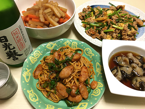 本日のメニューは、上段左からさつま揚げと大根とにんじんの味噌煮、豚キムチ、下段左からナポリタン、ツブ煮(既製品)、です。