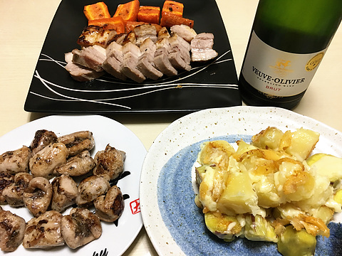 本日のメニューは、上段が塩焼き豚とにんじんのオーブン焼き、下段左から鮭白子のムニエル、じゃがいもとさつまいものチーズ焼き、です。