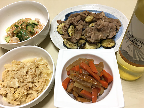本日のメニューは、上段左から鶏胸肉とたたききゅうりのごまキムチ和え、牛肉とナスのすき煮風にんにく醤油炒め、下段左から湯葉の煮浸し、さつま揚げと大根とにんじんの味噌煮、です。