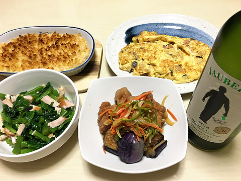 本日のメニューは、上段左から揚げない海老カツ、みそクリームオムレツ、下段左からスモークチキンとツルムラサキのナムル、とり唐揚げとナスの南蛮漬け、です。