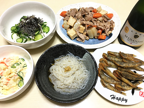 本日のメニューは、上段左からかぶときゅうりの塩昆布和え、豚肉と豆と根菜の中華炒め、下段左からポテトサラダ、シラウオのポン酢和え、メヒカリのから揚げ、です。