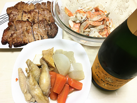本日のメニューは、上段左から豚肉の塩麹漬けの三種揚げ(とんかつ、天ぷら、竜田揚げ)、レンコンとにんじんとごぼうの胡麻サラダ、下段が鶏皮餃子と厚揚げと大根とにんじんの鶏ガラスープ煮、です。
