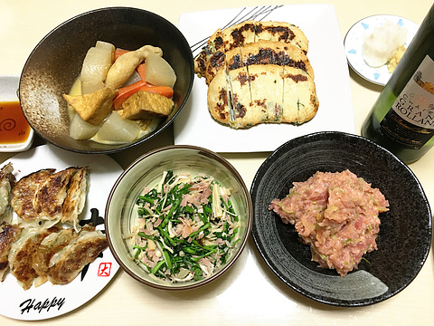 本日のメニューは、上段左から厚揚げと大根とにんじんのコンソメ煮、チーズと三つ葉のさつま揚げ(既製品を焼いたもの)、下段左から自家製焼き餃子、生ハムとクレソンとえのきのバターポン酢和え、ネギトロ、です。