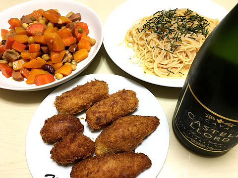 本日のメニューは、上段左からバターナットかぼちゃとにんじんと豆の塩炒め、タラコパスタ、下段が白身魚フライとクリームコロッケ(既製品を揚げたもの)、です。