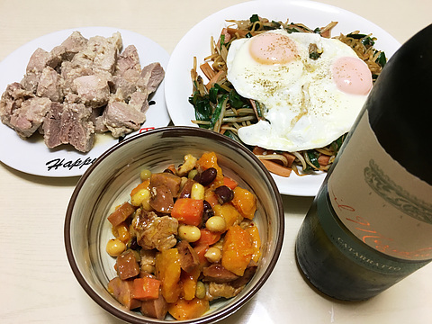 本日のメニューは、上段左から豚肉の酒粕味噌漬け、ニラもやし焼きそば、下段がバターナットかぼちゃとにんじんと豆の塩炒め、です。