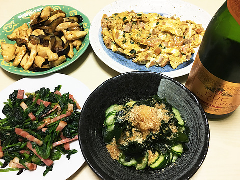 本日のメニューは、上段左から鶏胸肉とナスの焼肉のタレ炒め、残りものオムレツ、下段左からベーコンとほうれん草のバターソテー、わかめときゅうりの酢の物、です。