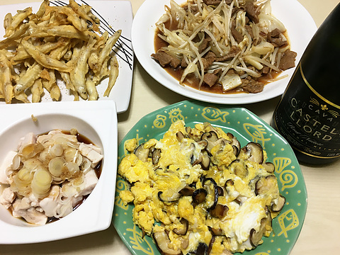 本日のメニューは、上段左からワカサギの天ぷら、ジンギスカン、下段左から鮭の白子ポン酢、しいたけの玉子炒め、です。