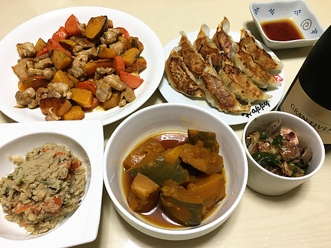 鶏肉とかぼちゃのゴマドレッシング炒め、他 本日のメニューは、上段左から鶏肉とかぼちゃのゴマドレッシング炒め、ジャンボにら餃子(既製品を焼いたもの)、下段左から卯の花、かぼちゃの煮付け、砂肝とイカのキムチ和え、です。