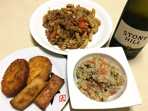 本日のメニューは、上段が豚肉と豆のボロネーゼ風フィジッリ、下段左からカレーコロッケと春巻き(既製品を揚げたもの)、卯の花、です。
