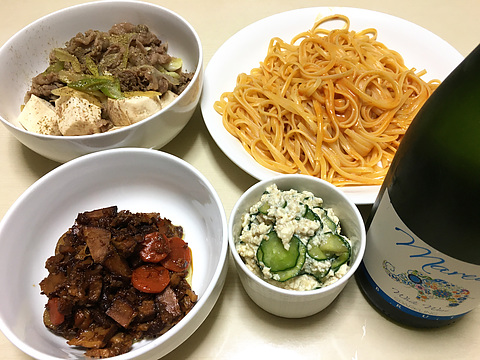 本日のメニューは、上段左から肉豆腐、カニトマトクリームパスタ、下段左から焼き豚とレンコンとにんじんのきんぴら風、きゅうりの白和え、です。