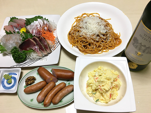 本日のメニューは、上段左から刺身盛り合わせ、ミートソースパスタ、下段左からソーセージ盛り合わせ、玉子ポテトサラダ(既製品)、です。