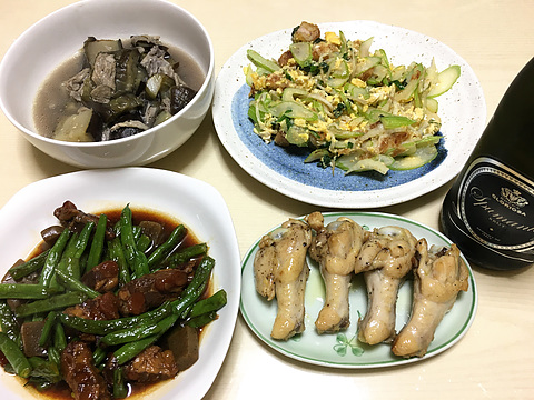 本日のメニューは、上段左から湯葉とナスの煮浸し、セロリと残り物の塩炒め、下段左から豚軟骨とインゲンの甘辛煮、鶏手羽元のコンフィのオーブン焼き、です。