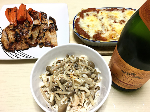 本日のメニューは、上段左から豚の塩麹漬けとにんじんのソテー、卯の花リメイクラザニア、下段が鶏皮としめじのピリ辛ドレッシング和え、です。