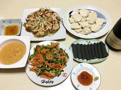 本日のメニューは、上段左から自家製焼き餃子、鶏胸肉の塩ダレ漬けのソテー、下段左からトマトポタージュ、鶏皮としめじとにんじんとピーマンのニンニク醤油炒め、胡麻豆腐、です。