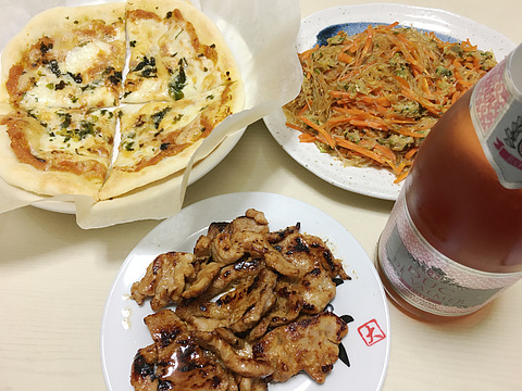 本日のメニューは、上段左から手作りトマトチーズピザ、餃子のたねのマーボー春雨、下段が豚肉の金山寺味噌漬け焼き(既製品を焼いたもの)、です。