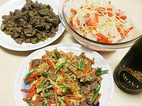 牛肉と春菊(の茎)の玉子炒め、他