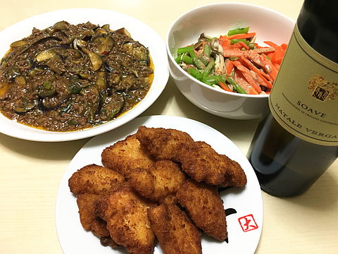 本日のメニューは、 上段左から麻婆ナス、にんじんと春菊の茎とシメジの梅ごまドレッシング和え、下段がチキンカツ(既製品を揚げたもの)、です。