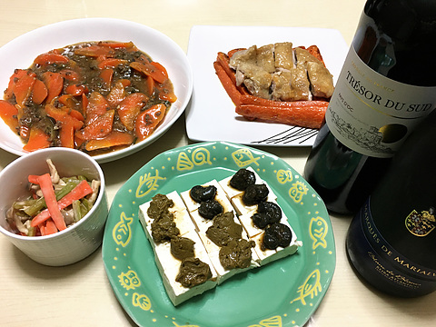本日のメニューは、上段左から麻婆にんじん、チキンとにんじんのグリル、下段左からにんじんと春菊の茎のサラダ、カニみそやっことサザエの肝煮やっこ、です。