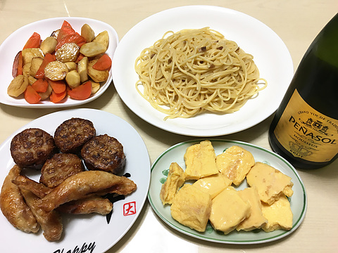 本日のメニューは、上段左から里芋とにんじんのバターポン酢炒め、いぶりがっことチーズのパスタ、下段左から揚げシュウマイと鶏皮餃子(既製品を揚げたもの)、玉子焼きの切り落とし、です。