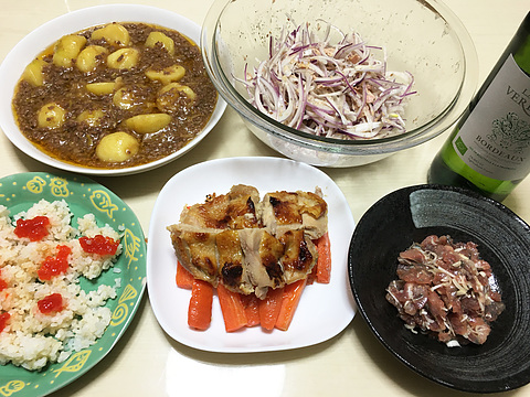 本日のメニューは、上段左から麻婆じゃがいも、赤玉ねぎとツナのサラダ、下段左から筋子ご飯、鶏の酒粕みそ漬け焼きとにんじんのソテー、サバのごまだれ漬け、です。