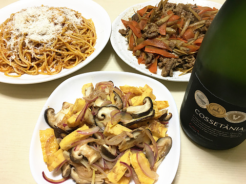 本日のメニューは、上段左からボロネーゼパスタ、牛肉とゴボウのしぐれ煮、下段がシイタケと紫玉ねぎと玉子焼きのバターポン酢炒め、です。