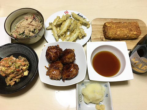 マッシュポテトの肉巻き、他 本日のメニューは、上段左からチャーシューと春雨のサラダ、ワカサギの天ぷら、干し海老ととろろ昆布の出汁巻き玉子、下段左からアボカド入りサーモンネギトロ、マッシュポテトの肉巻き、です。