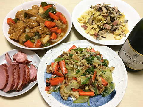 本日のメニューは、上段左から黒酢酢鶏、ベーコンとキノコのみそクリームパスタ、下段左からチャーシュー(既製品)、鶏皮のねぎ塩焼き、です。