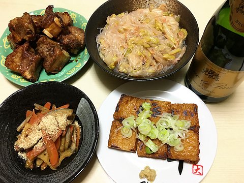 本日のメニューは、上段左からスペアリブのオーブン焼き、春雨と白菜の干し海老の中華煮、下段左からきんぴらごぼう、焼きさつま揚げ、です。