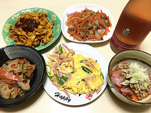 本日のメニューは、上段左からボロネーゼパスタ、にんじんと玉ねぎの麻婆炒め、下段左からきんぴらごぼう、ハムとスナップエンドウのオムレツ、ネギトロ納豆トマト和え、です。