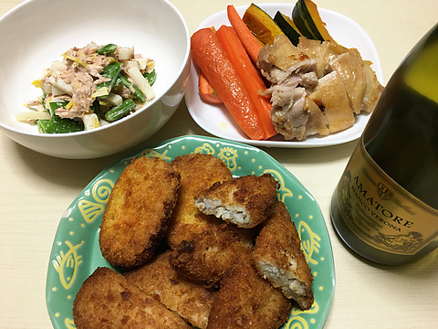本日のメニューは、 上段左からスナップエンドウと柚子大根のツナ和え、鶏塩麹漬けとにんじんとかぼちゃのオーブン焼き、下段が揚げ物各種(既製品を揚げたもの)、です。