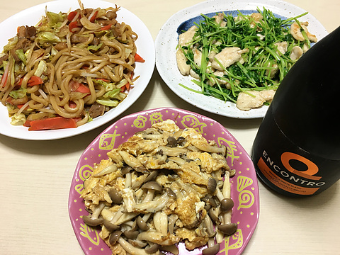 本日のメニューは、上段左から焼うどん、鶏胸肉と豆苗の塩炒め、下段が玉子としめじのオイスターソース炒め、です。