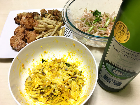 本日のメニューは、上段左から揚げ物各種(既製品を揚げたもの)、もやしとかぶの梅肉和え、下段がかぼちゃとサツマイモのサラダ、です。