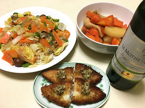 本日のメニューは、上段左から揚げビーフンの皿うどん風、鶏皮餃子とにんじんと大根のポン酢煮、下段が白身魚フライのオリーブソースがけ、です。