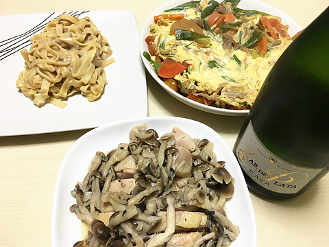 本日のメニューは、上段左からきのこクリームパスタ、牛すき風の玉子とじ、下段が鶏の塩麹漬けとしめじのレンジ蒸し、です。