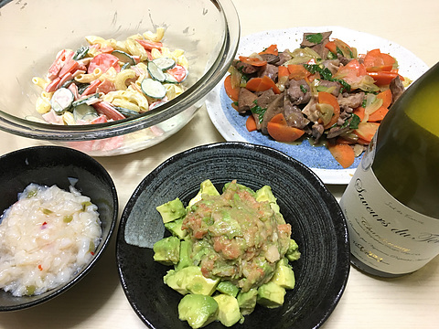本日のメニューは、上段左からマカロニサラダ、豚ハツと豚レバーの塩炒め、下段左からホタテワサビ(既製品)、アボカドのネギトロ和え、です。