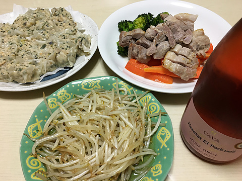 本日のメニューは、上段左から海鮮入り手作りシソシュウマイ、豚肉の塩麹漬けとにんじんとブロッコリーのオーブン焼き、下段がもやし炒め、です。