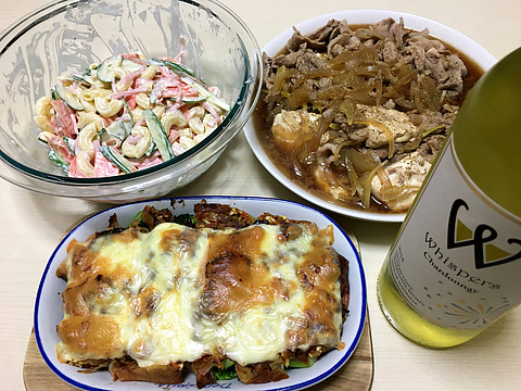 本日のメニューは、上段左からマカロニサラダ、肉豆腐、下段がブロッコリーのカレー春巻きみそチーズ焼き、です。