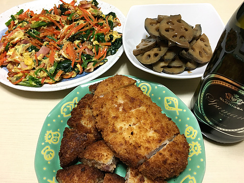 本日のメニューは、上段左からほうれん草とにんじんの玉子炒め、レンコンの煮物、下段が揚げ物各種、です。