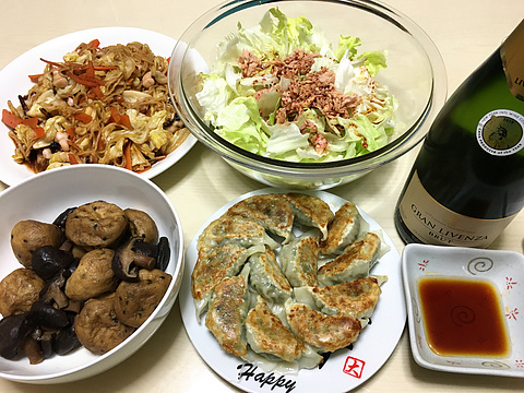 本日のメニューは、上段左からイカ焼きそば、ツナとレタスのピリ辛サラダ、下段左からがんもどきとシイタケの煮物、手作り焼き餃子、です。