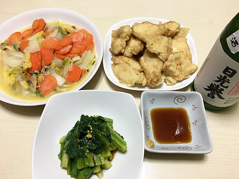 本日のメニューは、上段左からあさりと白菜とにんじんのクリーム煮、とり天、下段が小松菜の辛子和え、です。