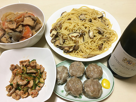 本日のメニューは、上段左からもつ煮、きのこの和風パスタ、下段左から豚コブクロのピリ辛和え、シュウマイ(既製品)、です。