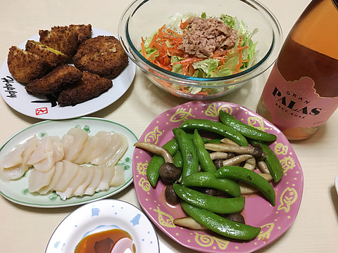 本日のメニューは、上段左から揚げ物各種、レタスとにんじんのツナサラダ、下段左からタイラ貝の刺身、しめじとスナップエンドウの塩炒め、です。