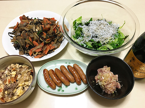 本日のメニューは、上段左からひじき入りきんぴら、キャベツとわかめのしらすサラダ、下段左から車麩と牛肉の煮物、焼きソーセージ、ネギトロ、です。