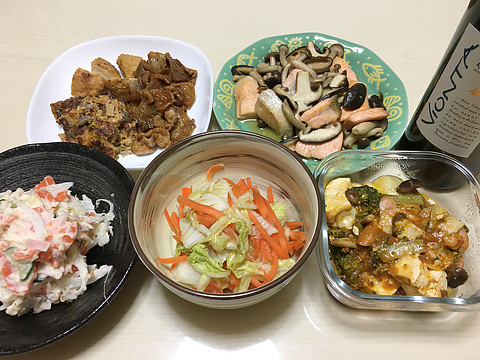 本日のメニューは、上段左から鶏つくねと鶏皮の焼き鳥&干し海老の玉子焼き、鮭ときのこのバターしょう油炒め、下段左からポテトサラダ、白菜とにんじんの玉ねぎドレッシング和え、豆腐のチーズ焼き、です。